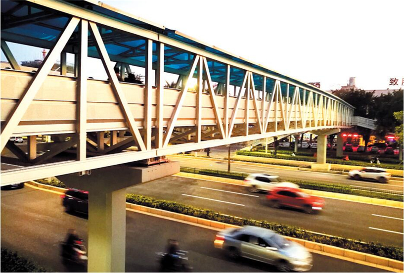 一橋一景緩解市民“過街難” 大學(xué)路上一座新建成的人行過街天橋造型則充滿現(xiàn)代感。銀白的靚麗色彩、簡約現(xiàn)代的...
